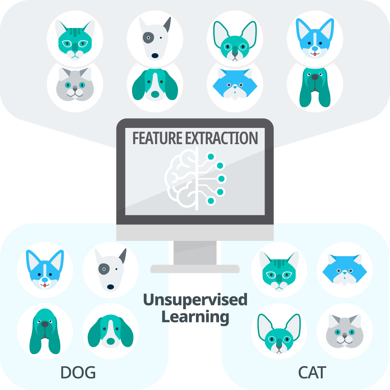 2) 비지도학습(unsupervised learning)에는 학습 데이터세트에 정답이 되는 레이블(정답 학습 데이터)이 포함되지 않습니다. 비지도학습은 학습 데이터세트가 주어지면 미리 결정된 규칙에 따라 학습 데이터세트를 분류하거나 학습 데이터가 가진 성질에 따라 모델을 만들어냅니다. 비지도학습은 자기 조직화 지도(Self-organizing Map)나 자기 부호화기(Auto Encorder)로 대표되는 일부 신경망이나 통계를 기반으로 한 군집분석(cluster analysis) 또는 주성분분석(principal component analysis) 등으로 구현된다.