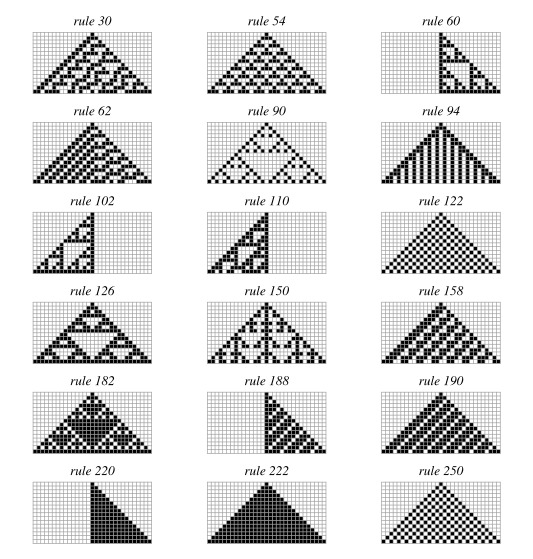 예를 들면, 상기 그림들 중 전이 규칙 18 및 규칙 110의 그림처럼 복잡한 패턴이 반복되는 경우는 생물활동의 결과나 어떤 종의 생리 현상으로 나타나는 것이라고 합니다.