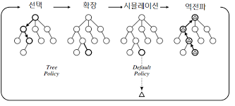 위 (1-1)에서는 규칙상 허용되는 수를 랜덤으로 선택해 게임을 진행합니다. 이처럼 승부가 날 때까지 게임을 진행하는 것을 플레이아웃(playout)이라고 하며, 어떤 보드에 대한 플레이아웃을 반복하면 그 보드가 평균적으로 어느 정도의 평갓값을 가지는지를 조사할 수 있다고 여깁니다. 이렇게 어떤 보드가 가진 여러 개 노드의 평갓값 중 가장 높은 값을 기준으로 다음 착수를 선택하는 것입니다. 이 방법이 몬테카를로 트리 탐색입니다. 이처럼 몬테카를로 트리 탐색에서는 플레이아웃의 보드 평가를 이용해 게임트리를 탐색합니다.