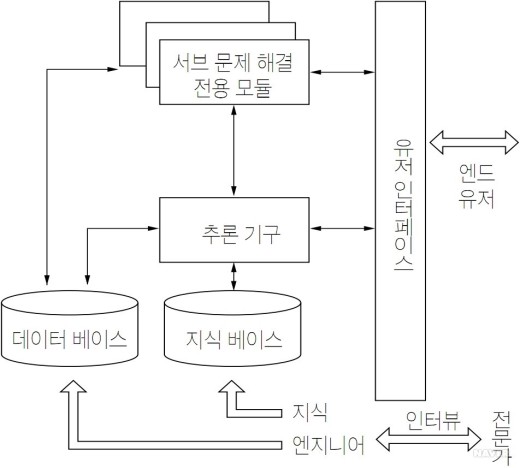 전문가 시스템은 지식표현의 집합인 지식 베이스(knowledge base)와 지식 베이스를 이용해서 추론을 실행하는 추론 엔진(Inference Engine: 추론 기구) 및 추론 과정을 보유하는 전용 모듈인 작업 기억(Working Memory)으로 구성됩니다. (아래 그림 참조)