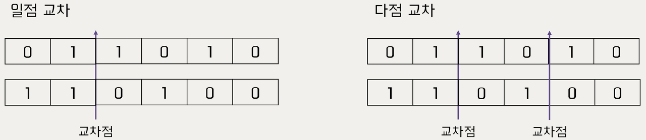 교차(crossover)는 부모 세대의 유전자에서 부모의 유전자를 골라내고 유전정보를 섞어 자식의 유전자를 생성합니다. 교차에는 일점 교차, 다점교차, 균등 교차, 임계 교차 등이 있습니다. 일점 교차(single point crossover)는 교차점이 한 개로 부모인 두 개의 유전자에 대해 교차점부터 앞뒤를 교환하는 방법으로 유전자를 물려줍니다. 다점 교차는 말 그대로 2 이상의 다점에서 교차합니다. 교차 과정은 일점 교차와 동일합니다. 그리고 균등 교차는 모든 유전자자리에서 확률적으로 유전자를 균등하게 나누어 교차하는 것입니다. 임계 교차는 임계점을 설정하고 그 임계점에 해당하는 유전자를 선택하여 교차하는 것입니다. 그림은 일점 교차와 다점 교차의 예시입니다.