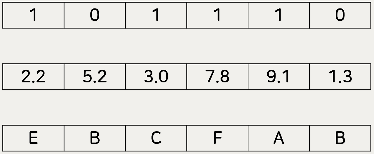 먼저 염색체 표현 방법을 알아봅니다. 유전 알고리즘에서는 염색체로 0과 1 이 숫자를 나열한 표현을 이용합니다. 구체적인 표현 방법은 풀어야 할 문제에 따라 다를 수 있으며, 아래 (그림 1)처럼 유전자의 성분으로 이진수, 실수, 문자 모두 가능합니다.