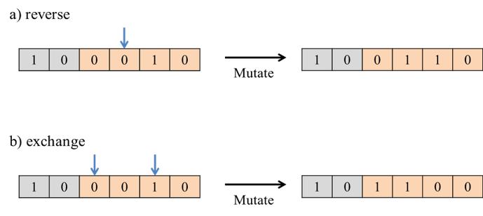 돌연변이(mutation)는 랜덤으로 유전정보를 바꾸는 조작입니다. 유전정보의 최소 단위인 유전자자리에 주목해서 낮은 확률로 유전자자리의 0과 1을 전향시키는 방법(reverse) 또는 두 개의 유전자라리 사이의 유전정보를 바꾸는 방법(exchange)입니다. 일반적으로 돌연변이를 발생하게 하는 확률값은 몇 % 정도의 낮은 수치를 지정합니다. 이 값이 너무 크면 유전적인 조작으로 획득한 형질이 금방 망가져버려서 진화가 멈춥니다. 반대로 너무 작으면 유전정보의 탐색 범위가 확장되지 못해서 진화가 정체됩니다. 설정값의 크기도 대상이 되는 문제의 성질이나 유전자의 표현 방법 또는 유전적인 조작 방법과 균형을 맞추어 결정되기 때문에 실험적으로 정할 수밖에 없습니다.