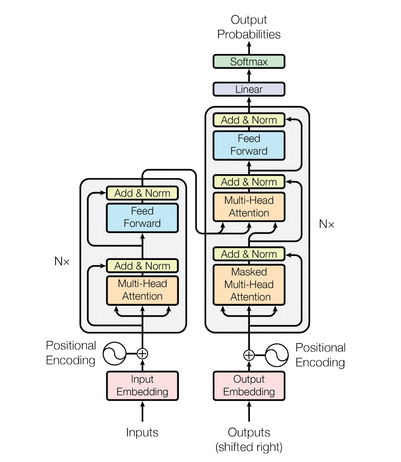 왼쪽 박스는 인코더이며 오른쪽 박스는 디코더입니다. 인코더 내 블록과 디코더 내 블록이 여러 개로 구성되어 있다는 것을 나타내기 위해 Nx로 표시하였습니다.