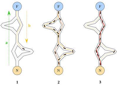 위 (그림)은 개미집단 최적화에의 최단 경로 탐색 원리를 나타냅니다. 즉, 개미집(N)과 먹이 장소(F) 사이의 최단경로를 탐색하는 과정입니다. 처음에는 개미들은 랜덤으로 경로를 선택해서 개미집(N)과 먹이장소(F) 사이를 왕복합니다. 개미는 이동시 다리에서 페로몬을 방출하는데, 페로몬의 화학물질로서 개미를 끌어당기는 성질이 있습니다. 경로 선택에서는 경로에 페로몬의 농도가 높은 쪽이 선택되기 쉽습니다. 또한 페로몬은 휘발성 물질이라 시간이 지나면서 농도가 줄어들게 됩니다.